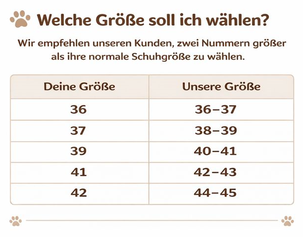 Wir empfehlen, zwei Nummern größer als Ihre normale Schuhgröße zu wählen. So haben Ihre Füße genug Platz und der Tragekomfort ist optimal, besonders mit Socken.